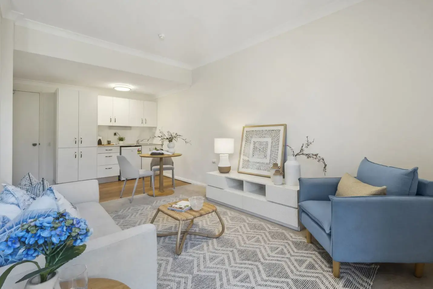The apartment also offers a modern, generously sized kitchenette and bathroom, all finished in neutral tones to create a calm and contemporary feel throughout.