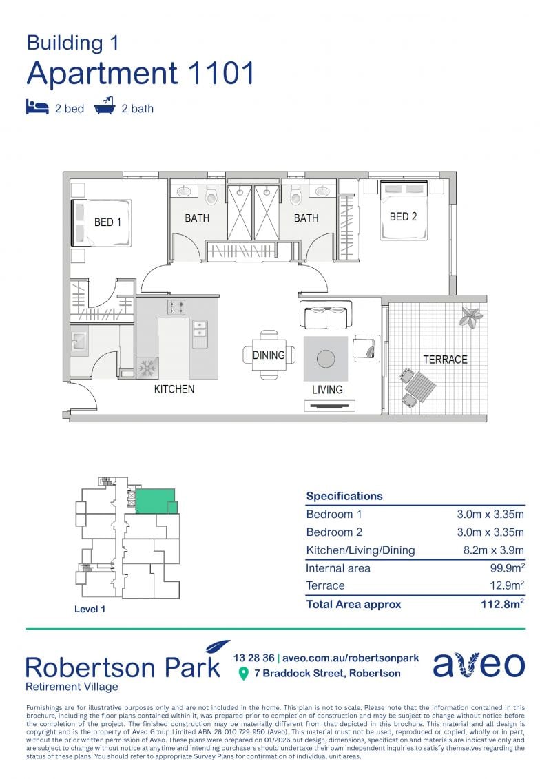 This beautiful two bedroom apartment is also located within the main community building, with all of the facilities, services and many activities just a short stroll away.