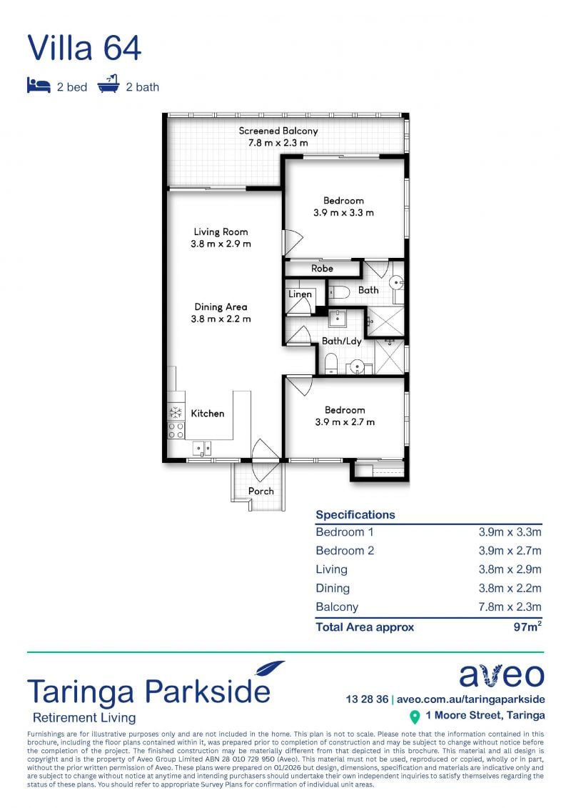 Villa 64 features two spacious bedrooms, each with built-in robes for added space. The two large bathrooms include modern fittings and fixtures, as well as a laundry space.