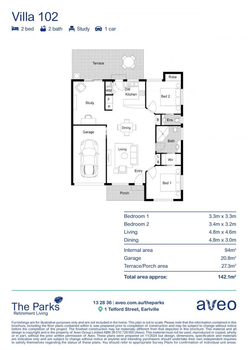 Villa 102 is located in a quiet street of The Parks Retirement Living community. It is a beautifully appointed villa ready for you to call home. At 142 sqm, there is enough space for you to spread out.