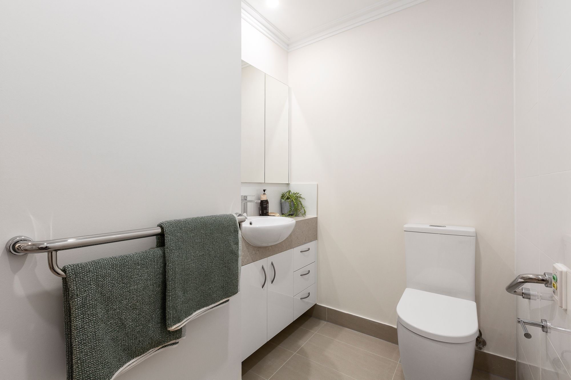 The spacious bedroom includes a built-in wardrobe, while the contemporary bathroom is fitted with accessible features for comfort and convenience.