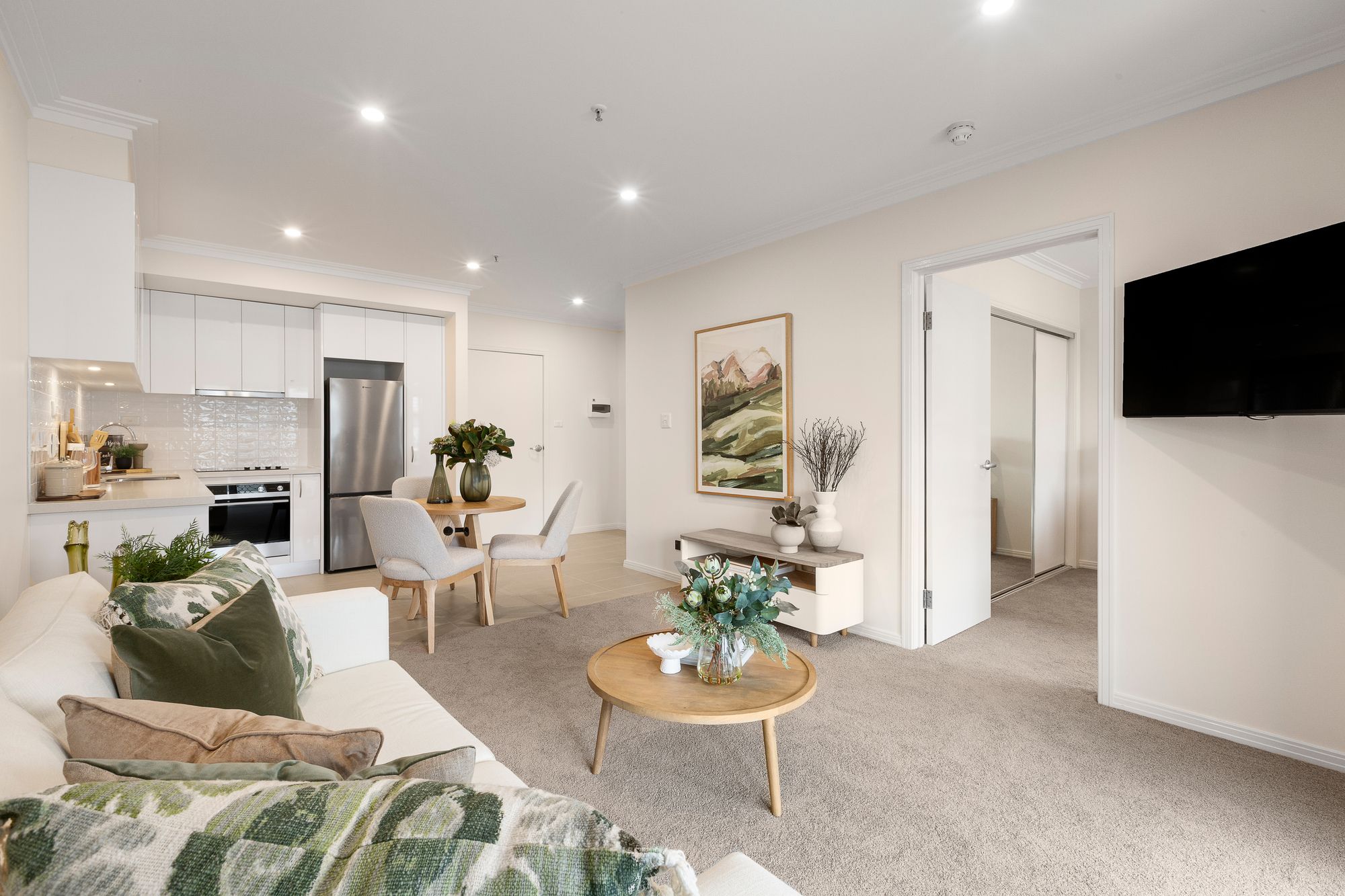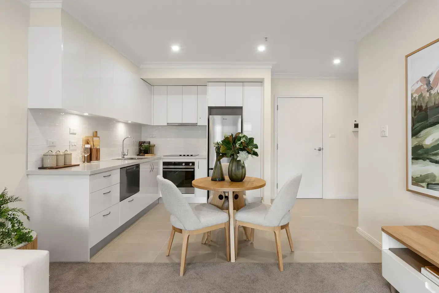 Filled with natural light, the open-plan living and dining area flows seamlessly into a stylish modern kitchen, featuring quality European appliances, soft-close cabinetry, and a single drawer dishwasher.