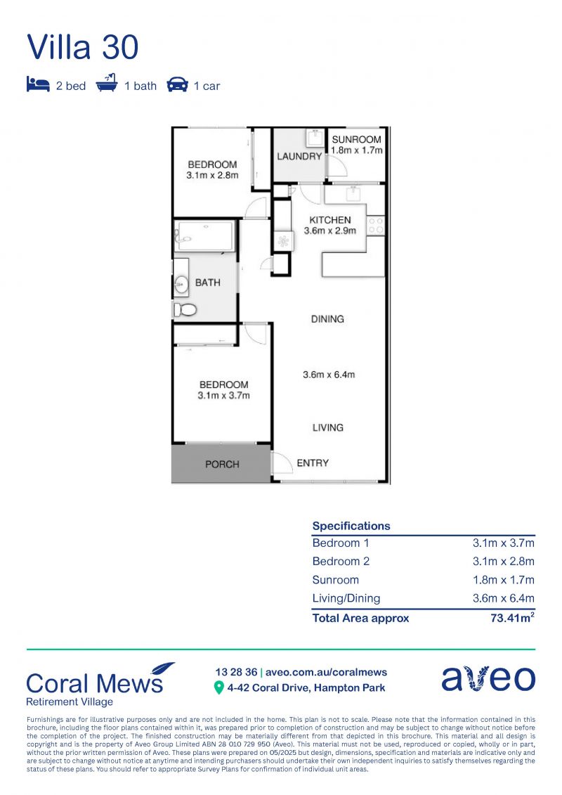 This beautifully presented villa offers comfort, convenience, and an inviting lifestyle within a vibrant community. Featuring a spacious living and dining area, two generously sized bedrooms, and a versatile combined sunroom and laundry, this home is designed for easy, modern living.