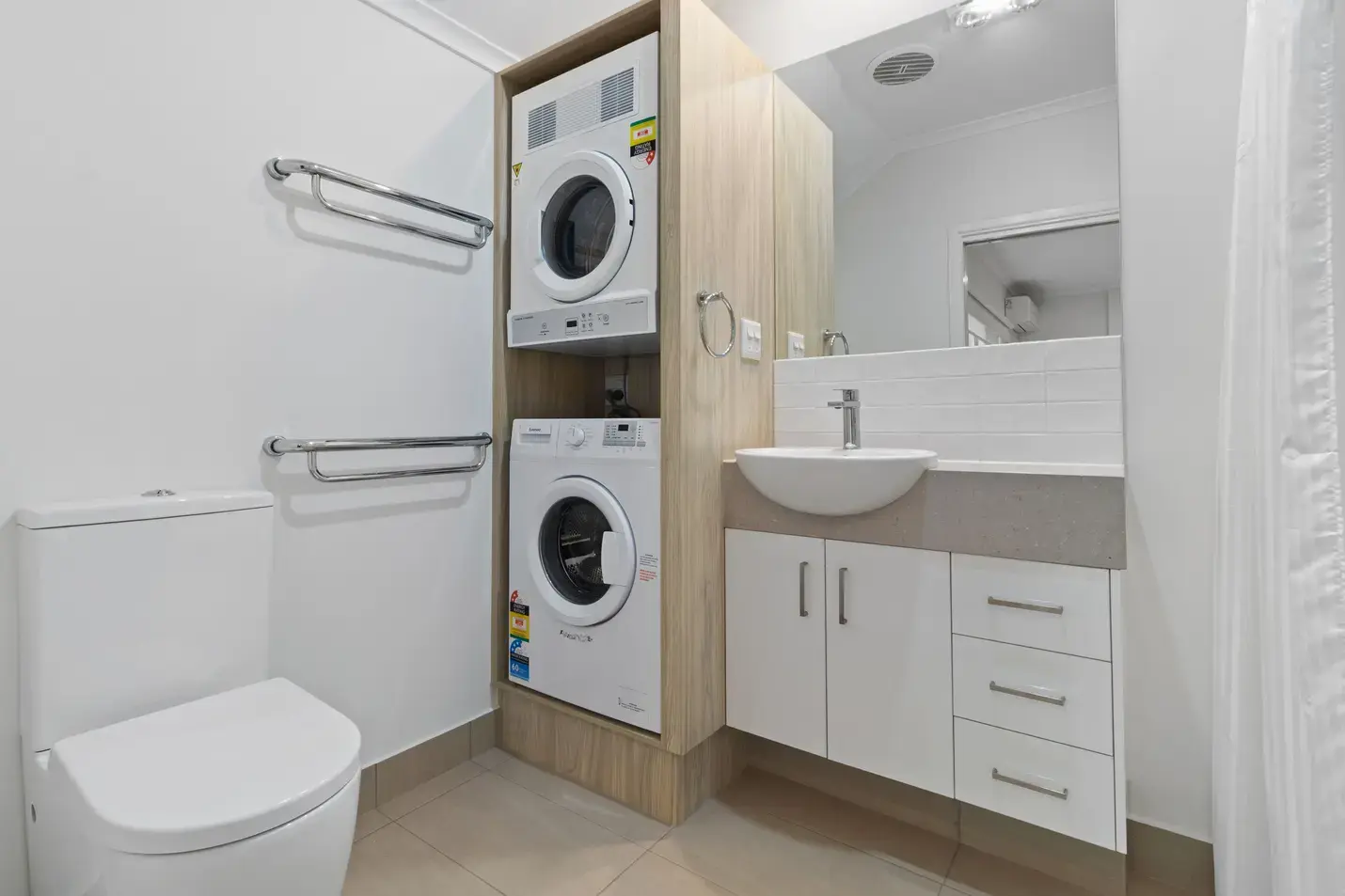 It features a compact kitchenette with a dishwasher, along with a modern bathroom fitted with a washer and dryer appliances for added convenience.