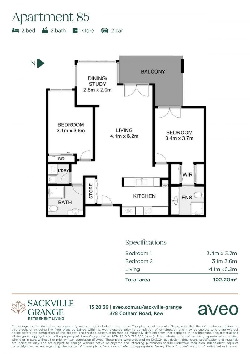 This stylish and elevated apartment at Sackville Grange offers two bedrooms, two bathrooms, plus a study/dining room with a bright and sunny balcony.